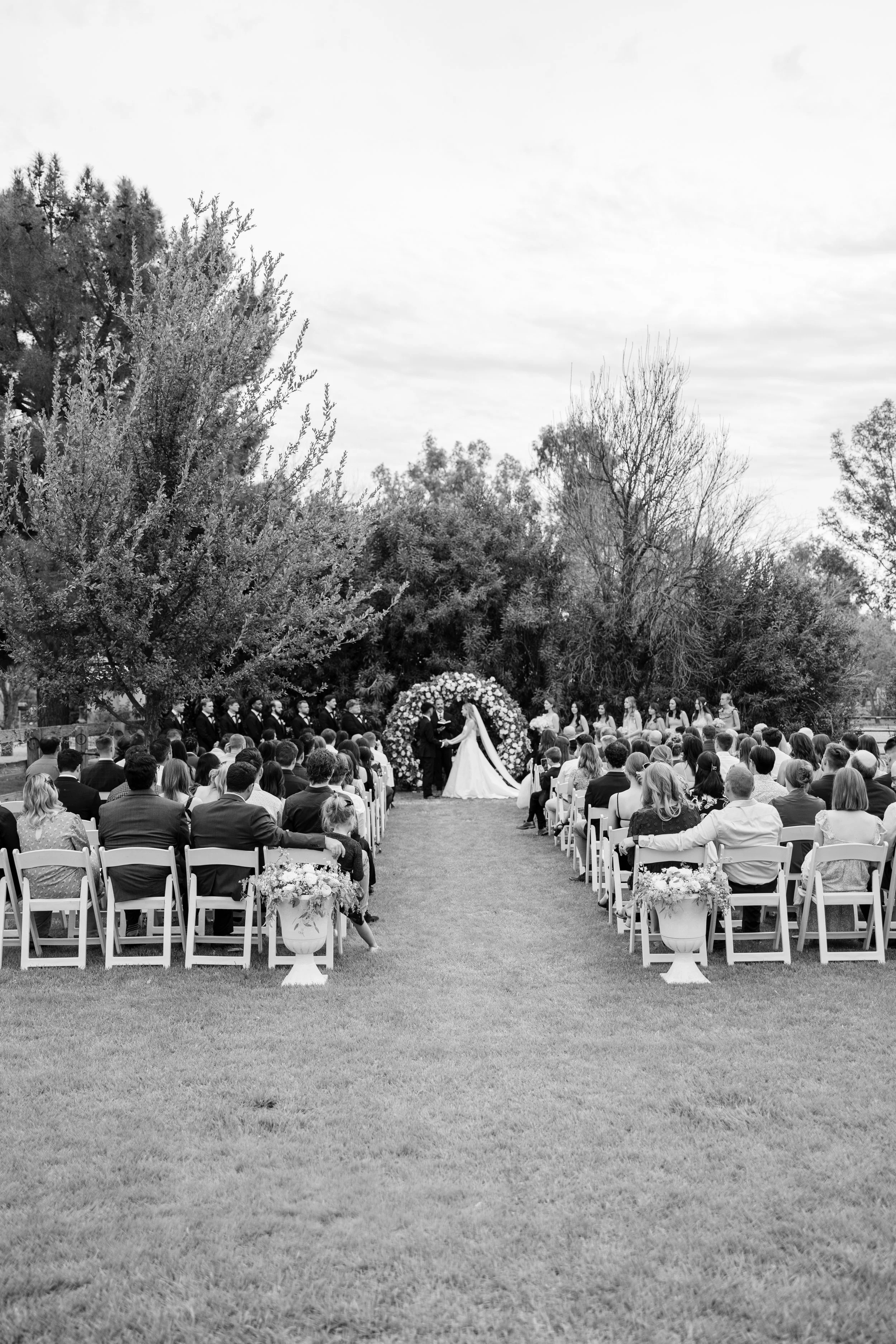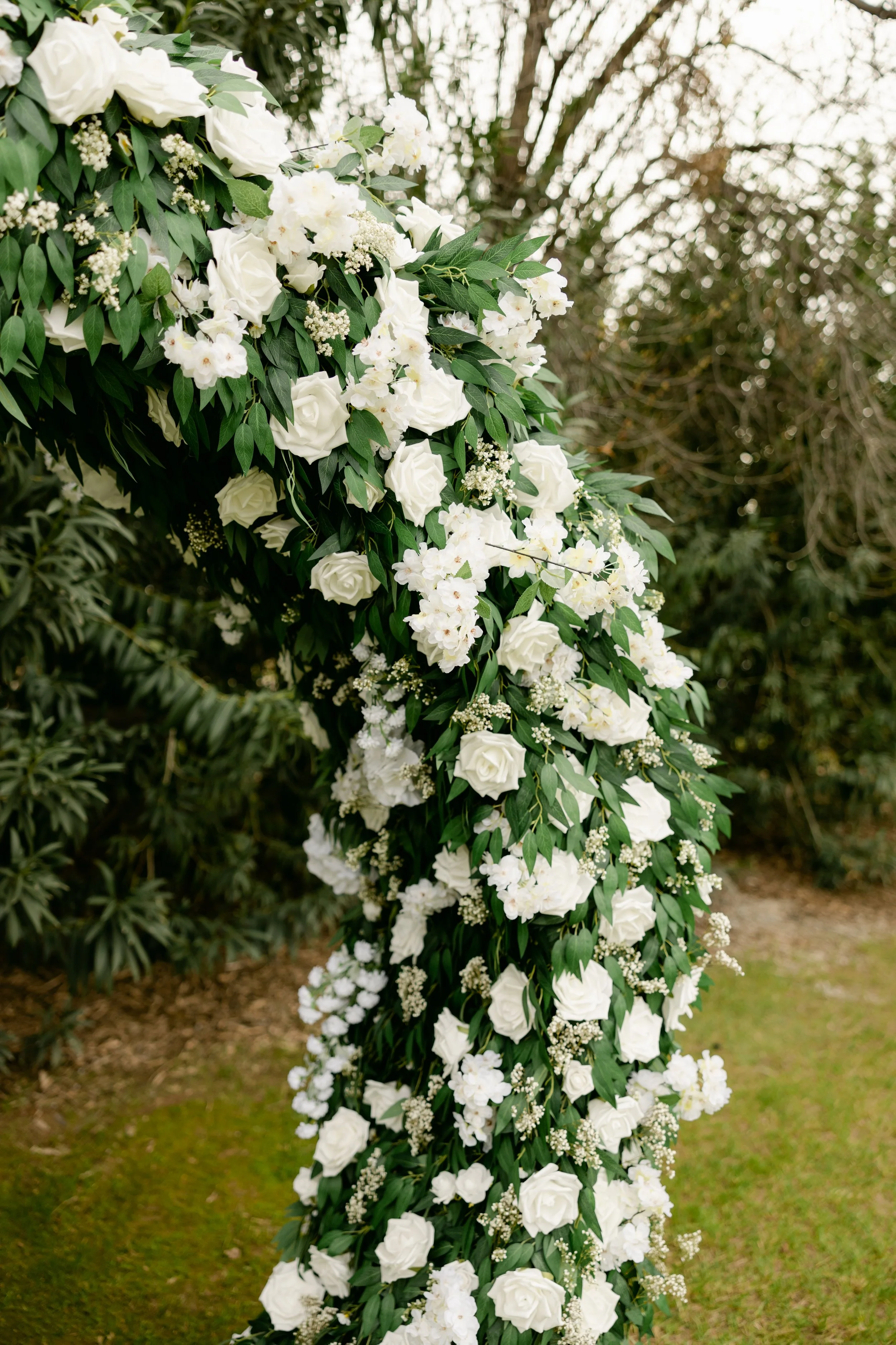 This 7 foot arch––adorned with white roses, carnations, and hydrangeas––will stand tall and strong behind you as you exchange the vows that take you across the threshold from engaged to officially married. Inquire For Availability ➛