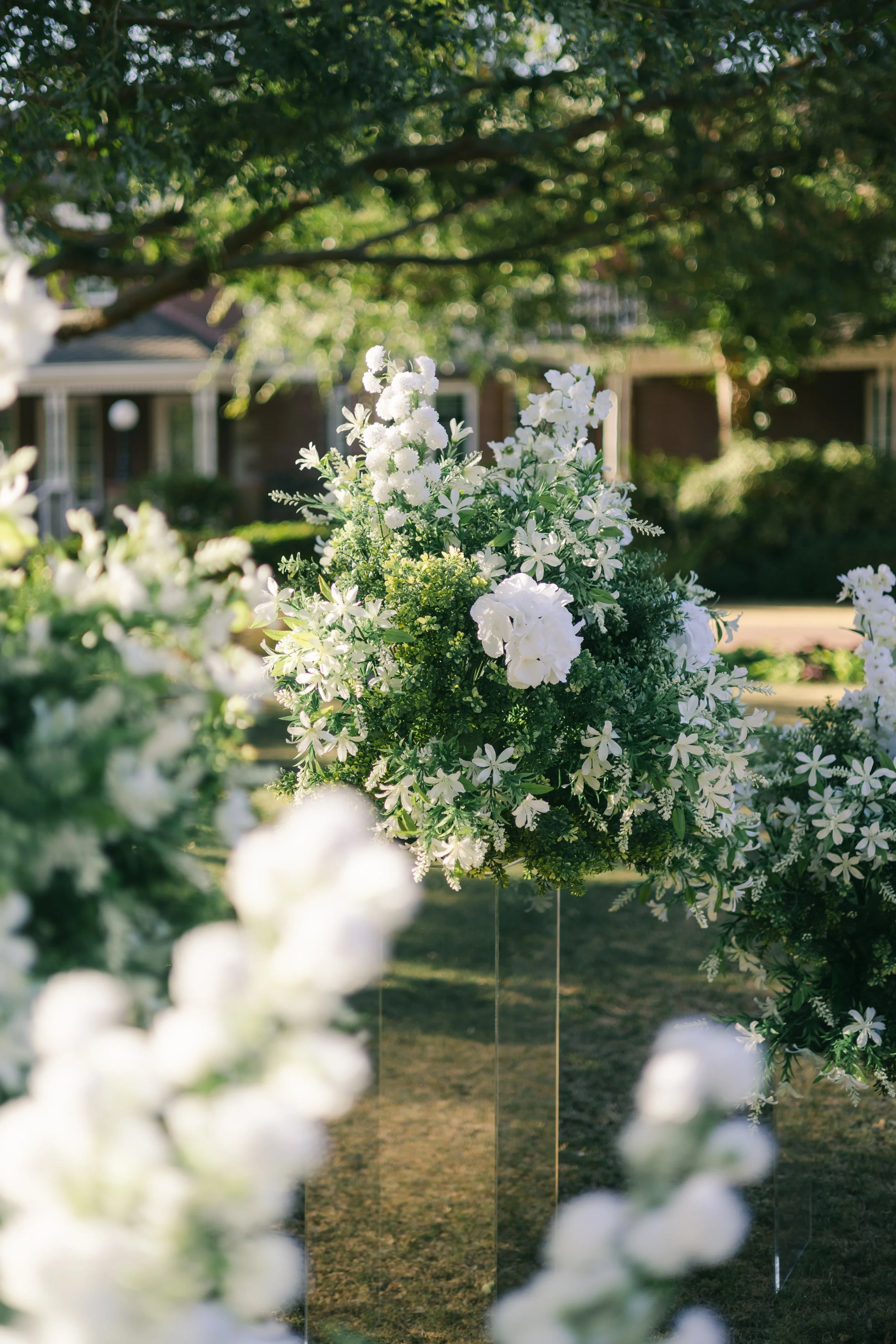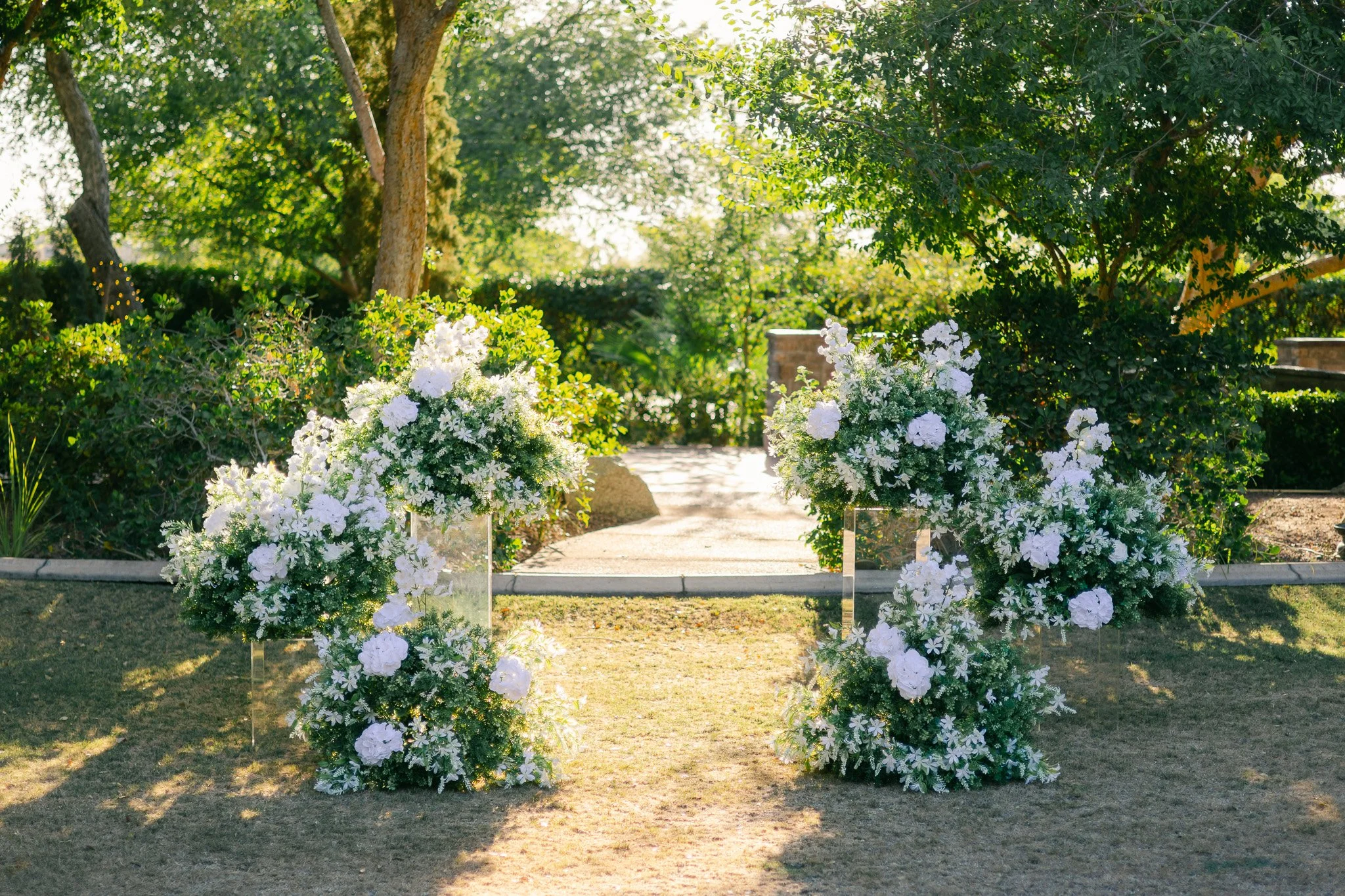 This set of 6 floral arrangements includes roses, hydrangeas, and 4 translucent acrylic pedestals which elevate 4 of the 6 arrangements, forming a circle around you and your fiancé to create an intimate, romantic focal point as you exchange your vows.